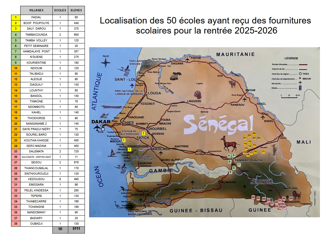 En 2025 les bénévoles de l’association ont apporté des fournitures scolaires à 50 écoles, réparties d’un bout à l’autre du Sénégal.