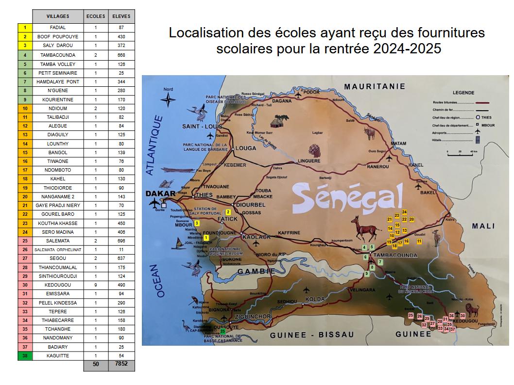 En 2024 les bénévoles de l’association ont apporté des fournitures scolaires à 50 écoles, réparties d’un bout à l’autre du Sénégal.